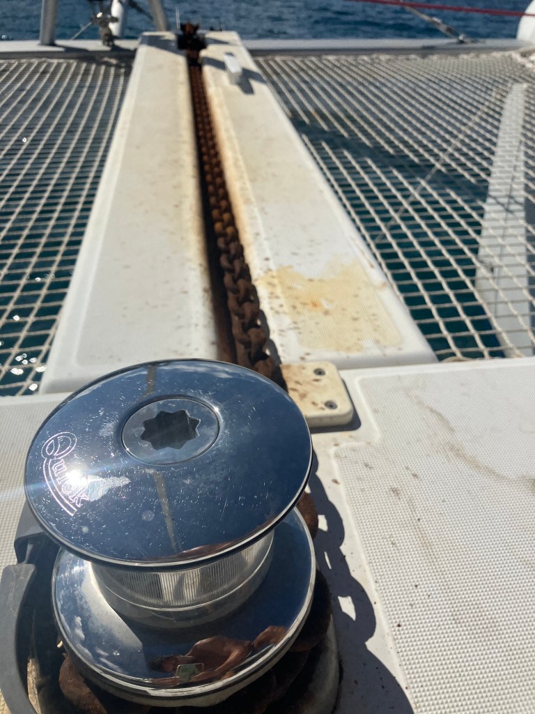 Our next option is a mooring ball. Moorings are cement weighted to the bottom of the ocean, with lines coming up to a floating ball or marker. We use our own mooring lines to tie the port and starboard hulls to the line on the mooring (think a big V). We like this option for many reasons- Its less likely that our boat will move because the moorings are built to stay where they are. Boats are more spread out over a mooring field (in the Caribbean, all moorings have been front tie only and are further apart, versus the moorings in Catalina we were so familiar with where you have to tie the bow AND stern and thus the island was able to pack in a lot more boats because they swung around a lot less). We get less bugs and vermin because we’re off the land, less sound and pollution, and more stability (we’ve weather tropical storms on moorings and not moved).